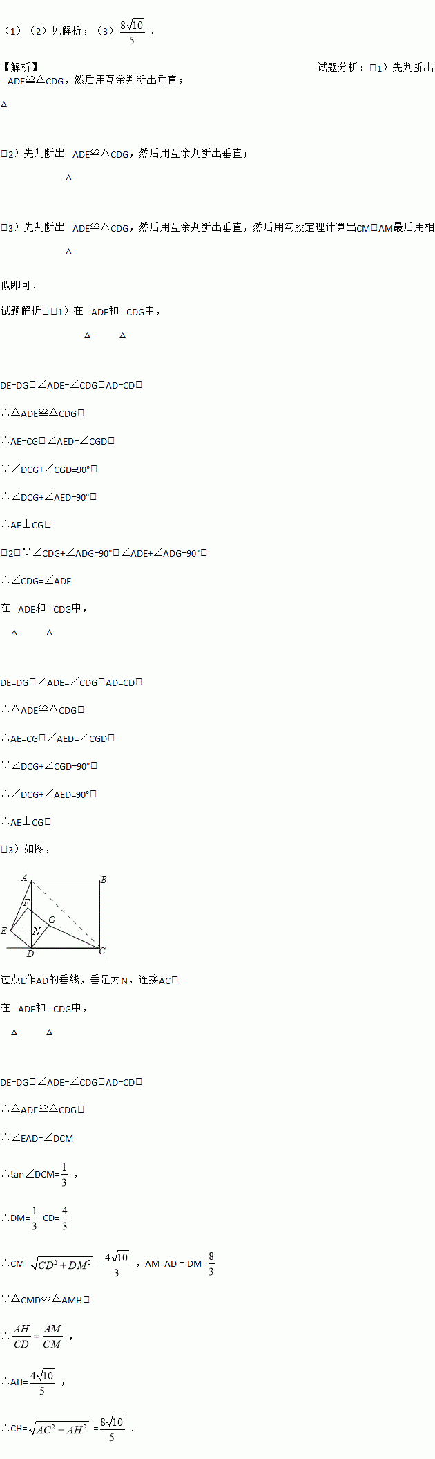 (3)如图3,当正方形DEFG绕点D顺时针旋转45°时,延长CG交AE于点H,当AD=4,DG=