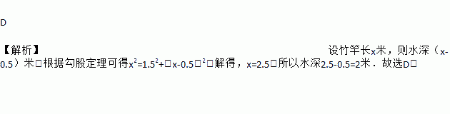 D 【解析】设竹竿长x米,则水深(x-0.5)米,根据勾股定理可得x2=1.52+(x-0.5)2,解得,x=2.5,所以水深2.5-0.5=2米.故选D.