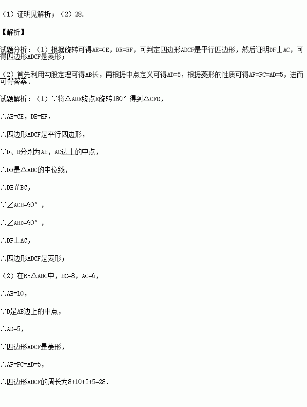 如图,在Rt△ABC中,∠ACB=90°,D、E分别为AB,AC边上的中点,连接DE,将△ADE绕点E旋转180°得到△CFE,连接AF,AC.