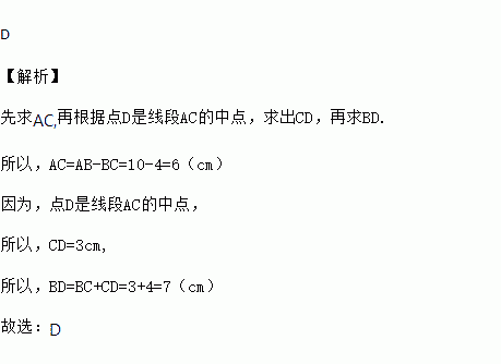 如图,点C、D是线段AB上的两点,点D是线段AC的中点.若AB=10cm,BC=4cm,则线段DB的长等于( )