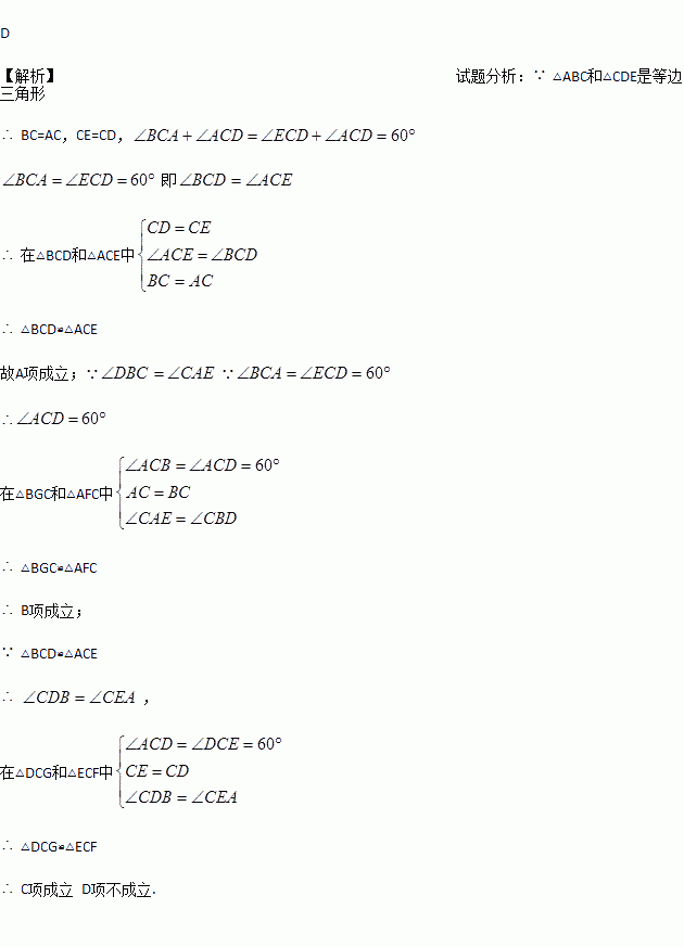 A. △ACE≌△BCD B. △BGC≌△AFC C. △DCG≌△ECF D. △ADB≌△CEA