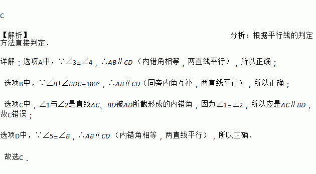 A. ∠3=∠4 B. ∠B+∠BDC=180° C. ∠1=∠2 D. ∠5=∠B