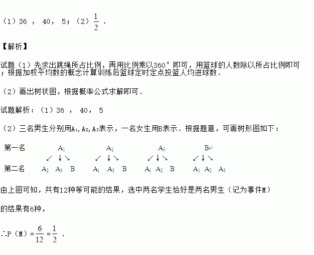 (1)扇形图中跳绳部分的扇形圆心角为 度,该班共有学生 人, 训练后篮球定时定点投篮平均每个人的进球数是 .