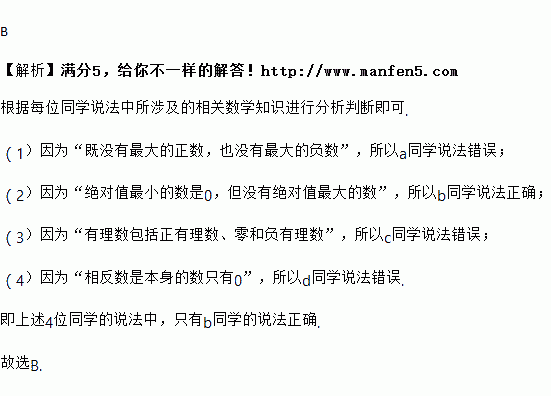 学完有理数后,a,b,c,d四名同学分别聊起来了,a说:“没有最大的正数,但有最大的负数”;b说:“有绝对值最小的数,没有绝对值最大的数”;c说:“有理数包括正有理数和负有理数”;d说:“相反数是它本身的数是正数”,你认为谁说得对呢?( )