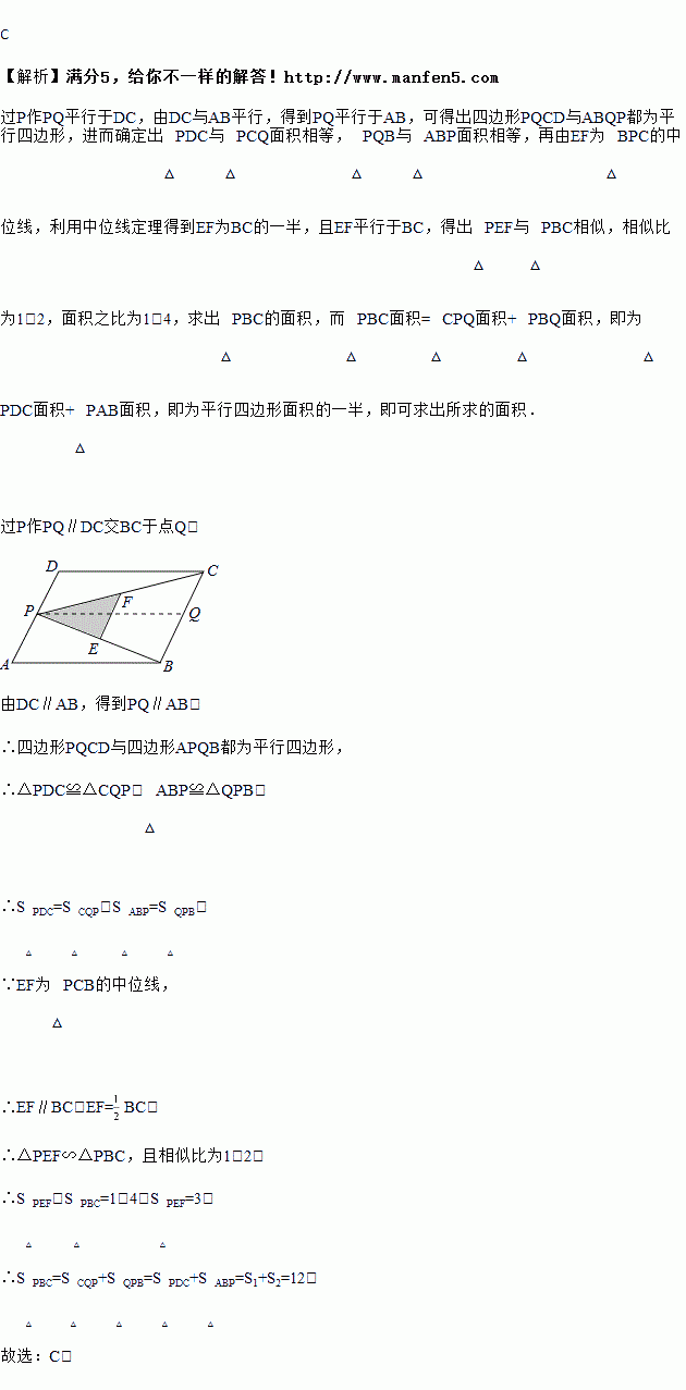 如图,P为平行四边形ABCD的边AD上的一点,E、F分别为PB、PC的中点,△PEF、△PDC、△PAB的面积分别为S、S1、S2.若S=3,则S1+S2的值为( )