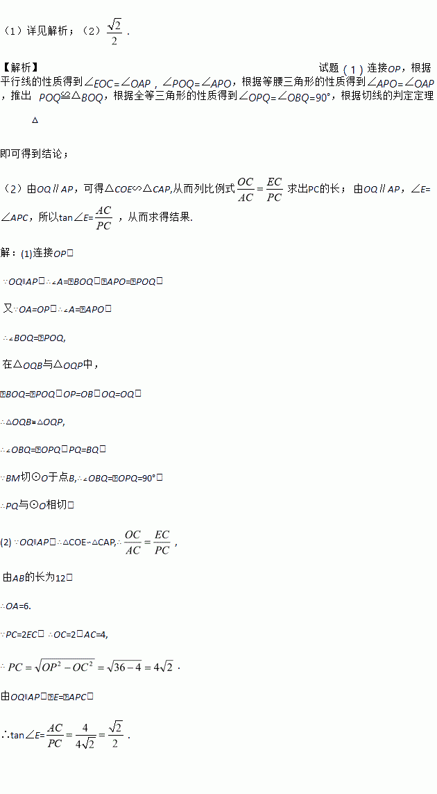 (2)若直径AB的长为12,PC=2EC,求tan∠E的值.
