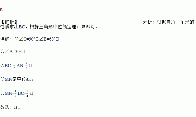 如图所示,△ABC中,已知AB=7,∠C=90°,∠B=60°,MN是中位线,则MN的长为( )