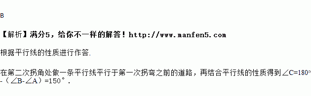 如图,一条公路修到湖边时,需拐弯绕道而过,如果第一次拐的∠A=120°,第二次拐的∠B=150°,第三次拐的∠C,这时的道路恰好和第一次拐弯之前的道路平行,则∠C是( )