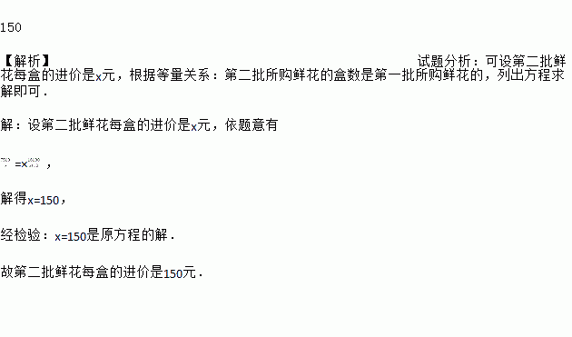 ,且每盒鲜花的进价比第一批的进价少10元.问第二批鲜花每盒的进价是多少元?