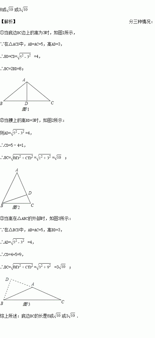 (本题10分)在△ABC中,AC=AB=5,一边上高为3,求底边BC的长(注意:请画出图形).