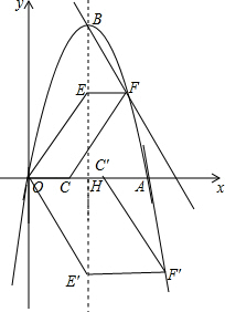 (3)如图,利用平行四边形OEFC和平行四边形OE′F′C′等高得到OC′=2OC,则可设OC=t,则OC′=2t,于是得到F点的横坐标为3+t,F′点的横坐标为3+2t,然后利用点F和F′的纵坐标互为相反数可列方程-(3+t-3)2+9+[-(3+2t-3)2+9]=0,解方程求出t的值,则可得到F点的坐标,从而得到E点坐标,最后利用正切的定义求解.
