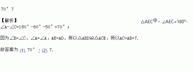 如图,已知∠B=∠C=50°,∠A=60°,则∠AEC=_______;若AE=AD,AB=7,则AC=_____.