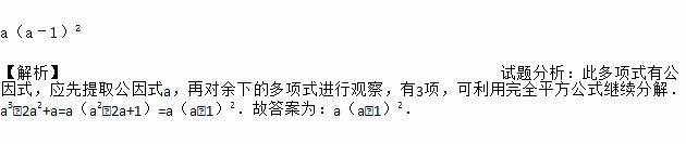 a(a﹣1)2 【解析】试题分析:此多项式有公因式,应先提取公因式a,再对余下的多项式进行观察,有3项,可利用完全平方公式继续分解.a3﹣2a2+a=a(a2﹣2a+1)=a(a﹣1)2.故答案为:a(a﹣1)2.
