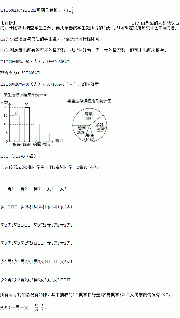 (3)在被调查的学生中,选修书法的有2名女同学,其余为男同学,现要从中随机抽取2名同学代表学校参加某社区组织的书法活动,请写出所抽取的2名同学恰好是1名男同学和1名女同学的概率.