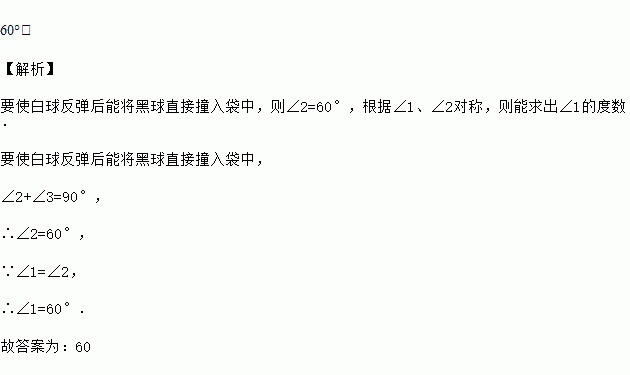 如图,∠1=∠2,若∠3=30°,为了使白球反弹后能将黑球直接撞入袋中,那么击打白球时必须保证∠1为_____°.