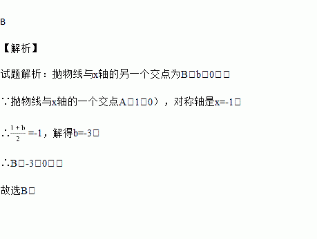 如图,抛物线与x轴的一个交点A(1,0),对称轴是x=-1,则该它与x轴的另一交点坐标是( )