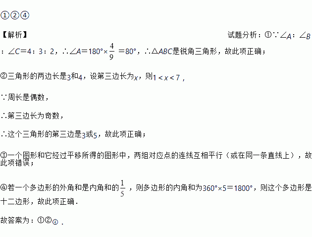 ①由∠A:∠B:∠C=4:3:2可确定△ABC是锐角三角形;