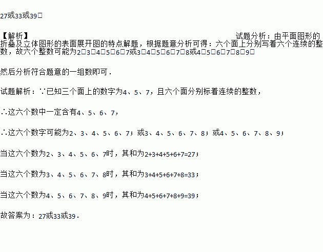 如图所示的立方体的六个面分别标着连续的整数,求这六个整数的和.