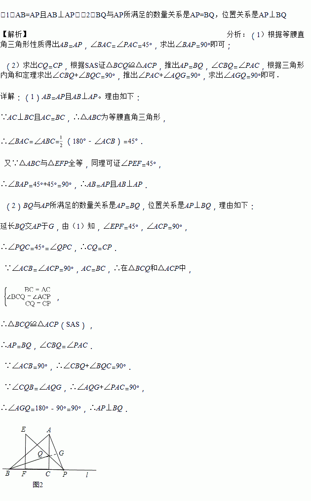(2)将三角板△EFP沿直线l向左平移到图②的位置时,EP交AC于点Q,连接AP、BQ.猜想写出BQ与AP满足的数量关系和位置关系,并说明理由.