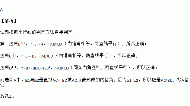 A. ∠4=∠3 B. ∠1=∠2 C. ∠B=∠5 D. ∠B+∠BCD=180°