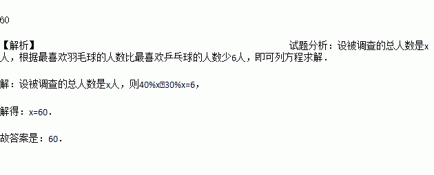 某学校“你最喜爱的球类运动”调查中,随机调查了若干名学生(每个学生分别选了一项球类运动),并根据调查结果绘制了如图所示的扇形统计图.已知其中最喜欢羽毛球的人数比最喜欢乒乓球的人数少6人,则该校被调查的学生总人数为___名.