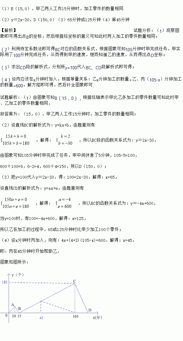 (4)为了使乙能与甲同时完成任务,现让丙帮乙加工,直到完成.丙每分钟能加工3个零件,并把丙加工的零件数记在乙的名下,问丙应在第多少分钟时开始帮助乙?并在图中用虚线画出丙帮助后y与x之间的函数关系的图象.