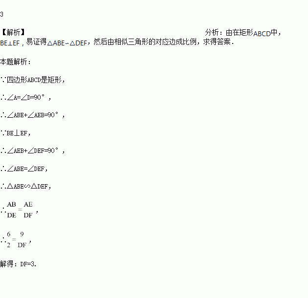 如图,在矩形ABCD中,点E、F分别在边AD、DC上,BE⊥EF,AB=6,AE=9,DE=2,求DF的长.