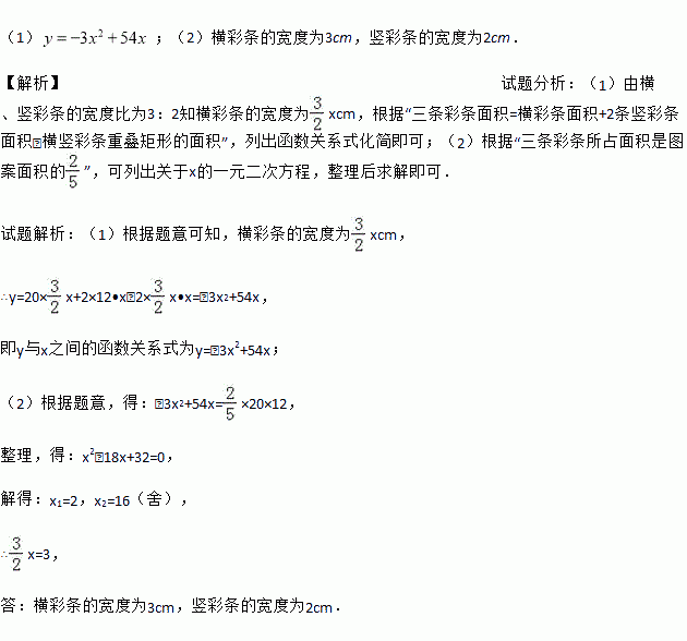 (2016内蒙古包头市)一幅长20cm、宽12cm的图案,如图,其中有一横两竖的彩条,横、竖彩条的宽度比为3:2.设竖彩条的宽度为xcm,图案中三条彩条所占面积为ycm2.