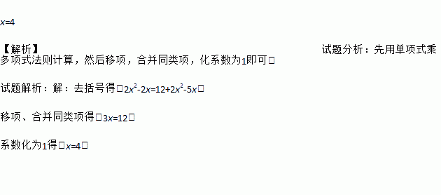 x=4 【解析】试题分析:先用单项式乘多项式法则计算,然后移项,合并同类项,化系数为1即可. 试题解析:【解析】 去括号得:2x2-2x=12+2x2-5x, 移项、合并同类项得:3x=12, 系数化为1得:x=4.