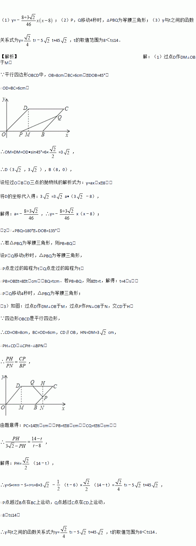 如图,平行四边形OBCD中,OB=8cm,BC=6cm,∠DOB=45°,点P从O沿OB边向点B移动,点Q从点B沿BC边向点C移动,P,Q同时出发,速度都是1cm/s.