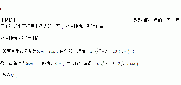 一个直角三角形的三边长分别是6cm、8cm、xcm,则x的值为( )