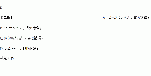 A. a3+a3=a6 B. 3a-a=3 C. (a3)2=a5 D. a·a2=a3