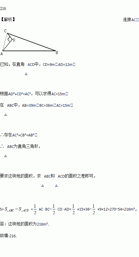 如图所示的一块地,∠ADC=90°,AD=12m,CD=9m,AB=39m,BC=36m,则这块地的面积为 ______ m2.