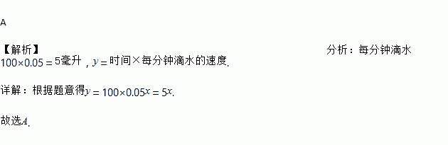 目前,全球水资源日益减少,提倡全社会节约用水.据测试:拧不紧水龙头每分钟滴出100滴水,每滴水约0.05毫升.小欢同学洗手后,没有把水龙头拧紧,水龙头以测试的速度滴水,当小欢离开x分钟后,水龙头滴出y毫升的水,请写出y与x之间的关系式是( )