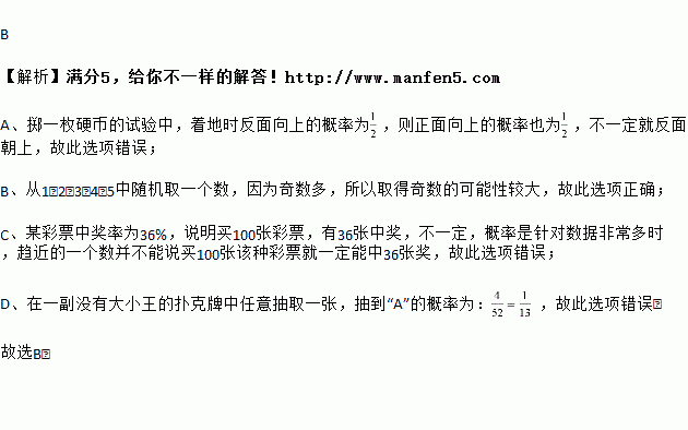 C. 某彩票中奖率为,说明买100张彩票,有36张中奖。![]()