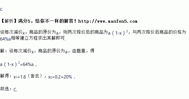夏末,某款衣服的零售价经过两次降价后,其价格为降价前价格的,则平均每次降价( )