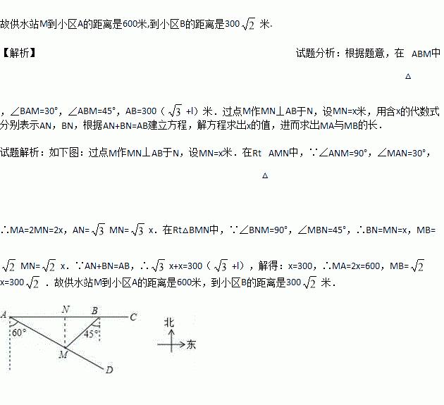 如图,某市对位于笔直公路AC上两个小区A,B的供水路线进行优化改造,供水站M在笔直公路AD上,测得供水站M在小区A的南偏东60°方向,在小区B的西南方向,小区A,B之间的距离为300(