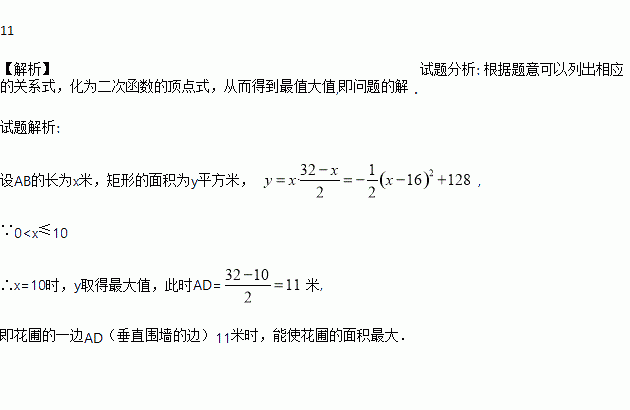 小明家门前有一块空地,空地外有一面长10米的围墙,为了美化生活环境,小明的爸爸准备靠墙修建一个矩形花圃 ,他买回了32米长的不锈钢管准备作为花圃的围栏(如图所示),花圃的一边AD(垂直围墙的边)究竟应为多少米才能使花圃的面积最大?
