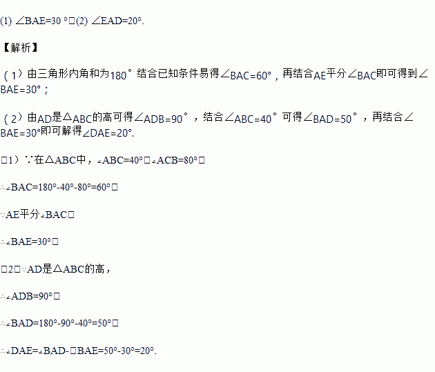 如图,在△ABC中,∠B=40°,∠C=80°,AD是BC边上的高,AE平分∠BAC.