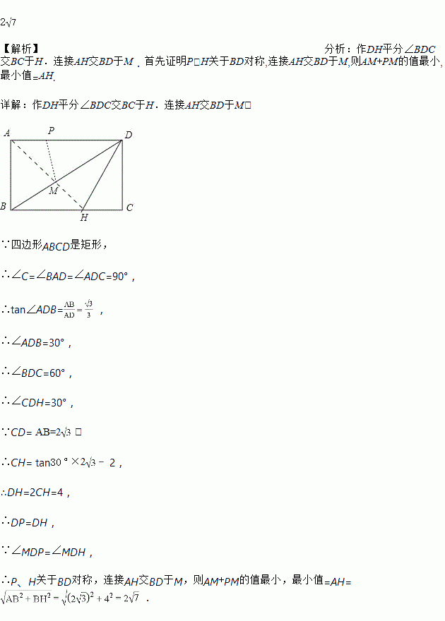 ,AD=6,P为边AD上一点,且AP=2,在对角线BD上寻找一点M,使AM+PM最小,则AM+PM的最小值为_____.