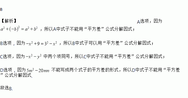 下列多项式中能用平方差公式分解因式的是( )
