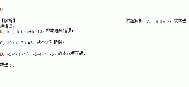A. -4-3=-1 B. 5-(-5)=0 C. 10+(-7)=-3 D. -5-4-(-4)=-5