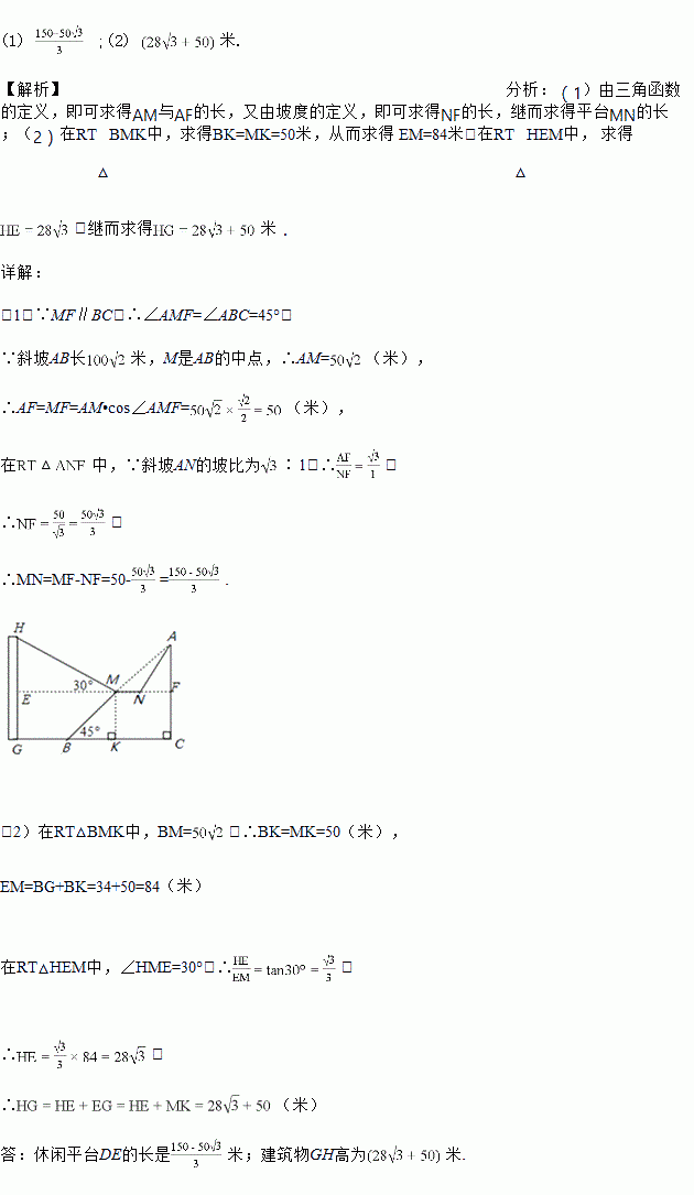 米,坡角(即∠ABC)为45°,AC⊥BC,现计划在斜坡中点M处挖去部分斜坡,修建一个平行于水平线CB的休闲平台MN和一条新的斜坡AN.(温馨提示:后两个小题结果都保留根号)