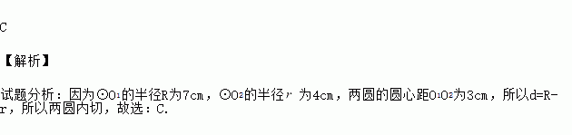 已知⊙O1的半径R为7cm,⊙O2的半径为4cm,两圆的圆心距O1O2为3cm,则这两圆的位置关系是( )