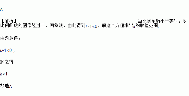 反比例函数y=的图象的一支在第二象限,则k的取值范围是 ( )