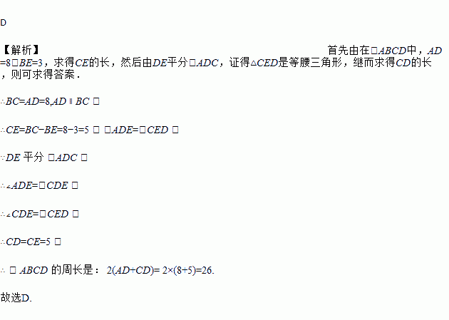 如图,在ABCD 中,DE平分∠ADC,AD=8,BE=3,则ABCD 的周长是( )
