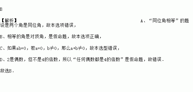 A、“同位角相等”的题设是“两个角相等” B、“相等的角是对顶角”是假命题