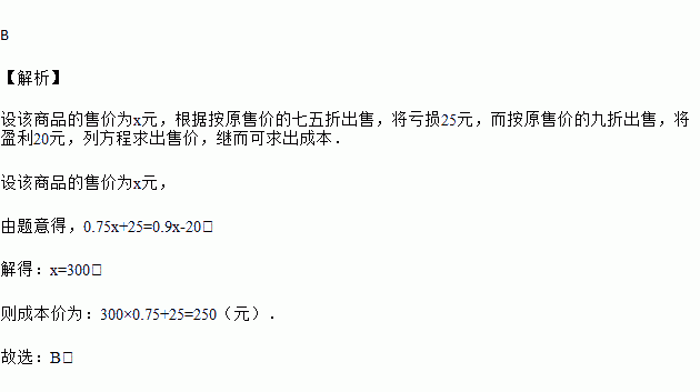 某商店换季准备打折出售某商品,如果按原售价的七五折出售,将亏损25元,而按原售价的九折出售,将盈利20元,则该商品的成本为