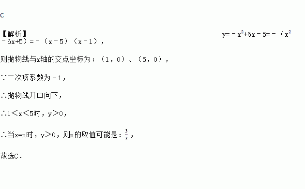 已知函数y=﹣x2+6x﹣5,当x=m时,y>0,则m的取值可能是( )
