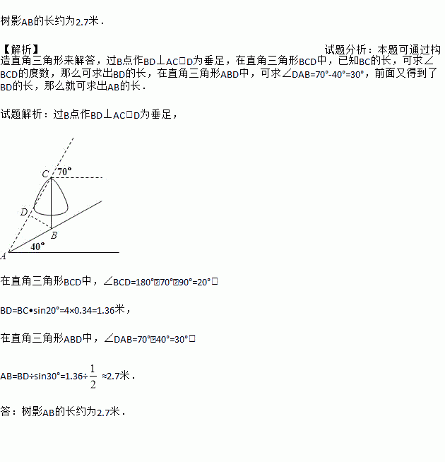 如图,在一个坡角为40°的斜坡上有一棵树BC,树高4米.当太阳光AC与水平线成70°角时,该树在斜坡上的树影恰好为线段AB,求树影AB的长.(结果保留一位小数)